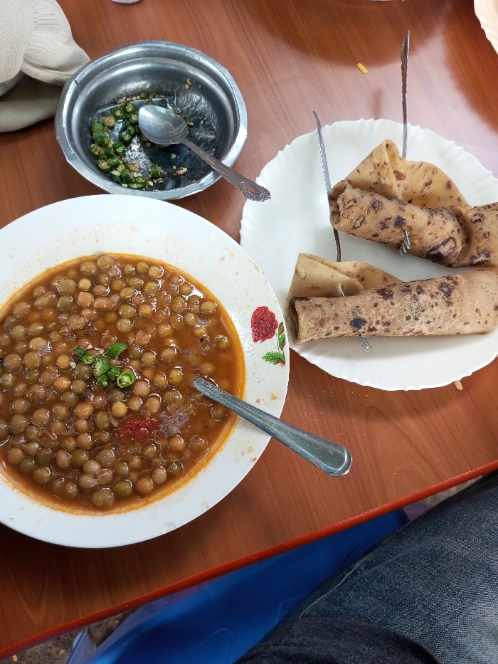 A table spread features a hearty meal. A white bowl holds a stew-like dish with peas, adorned with a spoon. A metal bowl contains chopped green chilies and a spoon. A white plate presents rolled flatbreads secured with metal skewers. The table is wooden, and a hint of blue and denim suggests someone is seated.