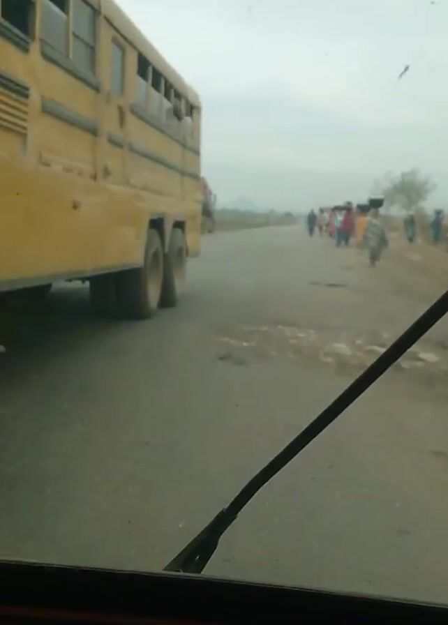 view from inside a vehicle driving down a road. A yellow bus is to the left of the vehicle, and a group of people are walking on the right side of the road. Further down the road, a tanker truck is visible. The sky is overcast. The road surface appears to have some potholes. The vehicle's windshield wiper is visible in the foreground.