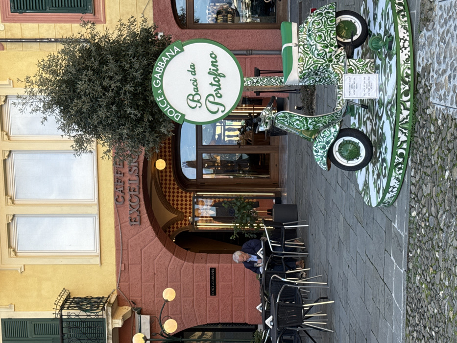 The image depicts an outdoor scene in Portofino, Italy, featuring a cafe, a seated individual, and a decorative display