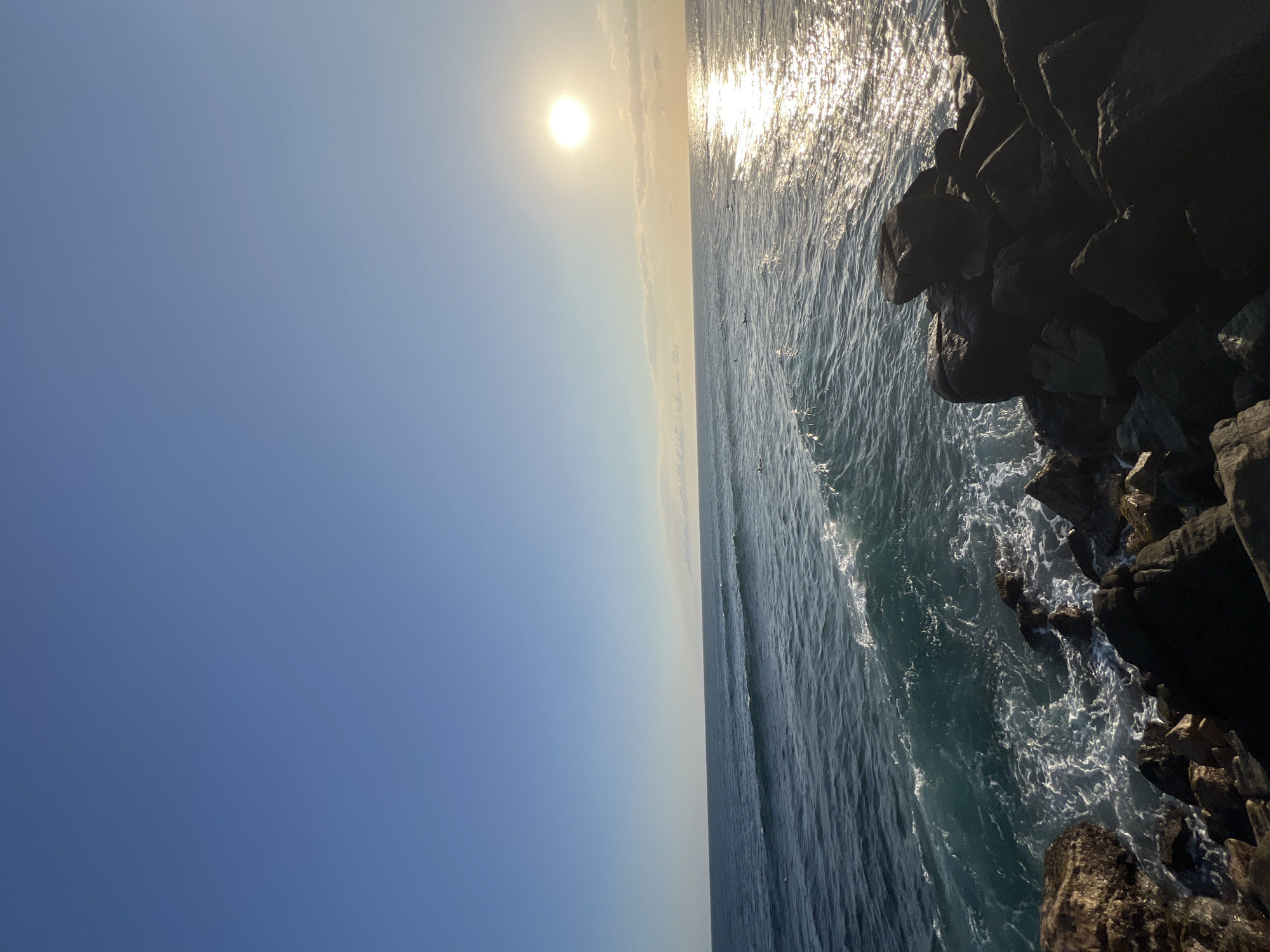 The scene depicts a coastal landscape in Goviyapana, Sri Lanka, during a late afternoon or sunset. The sky is largely clear and blue, transitioning to a lighter hue near the horizon where the sun is prominently visible on the right, casting a bright, glinting reflection across the ocean surface towards the viewer. The ocean features dark blue-green water with multiple parallel waves rolling towards the shore. In the mid-ground, scattered across the waves, are approximately 10 to 15 dark, human-like figures, identified as surfers or bodyboarders, positioned on boards in the water. The foreground and lower right section of the image are dominated by dark, rugged rock formations, likely a natural coastline or a man-made breakwater, against which waves are breaking and generating white foam. No explicit interactions between individuals are discernible, nor are specific identifiable objects beyond the rocks, water, sky, sun, and surfers/boards.
