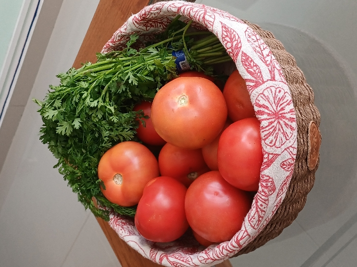 A woven basket containing produce is centered on a light-colored, reflective surface, likely glass, in an indoor setting. The basket is constructed from dark brown braided material and lined with a white fabric featuring a repeating red pattern resembling citrus slices or abstract floral designs. A small, light brown, oval-shaped tag is affixed to the basket's exterior. Inside the basket are approximately 10-12 ripe tomatoes, varying in color from red to orange-red. A large bunch of green leafy herbs, consistent with cilantro or flat-leaf parsley, stands upright in the back right portion of the basket, secured by a small blue band around its stems. The immediate background includes a blurred wooden surface to the left and a light-colored wall or window structure with a horizontal blue line above. No individuals are present. The specific location within the city of Cali, Colombia, is not discernible from the visual information provided.