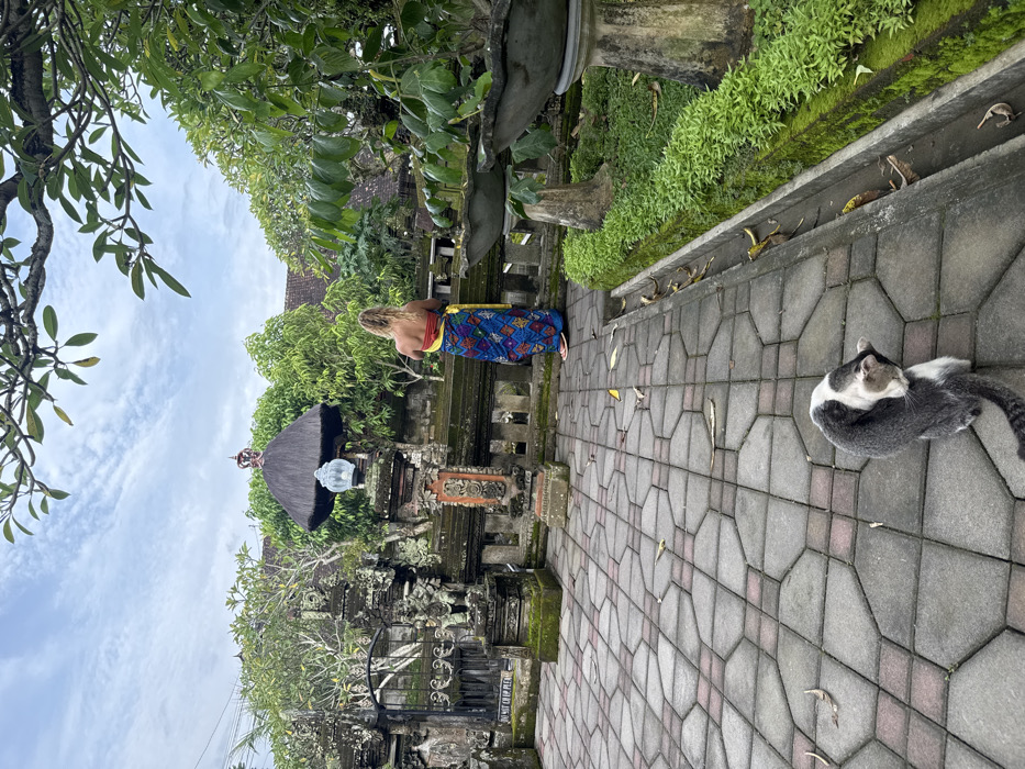 The image depicts an outdoor scene within a traditional Balinese compound in Batuan, Indonesia, under an overcast sky. In the foreground, a gray and white cat is observed cleaning itself on a geometrically patterned paved area composed of gray and red interlocking concrete pavers, some of which have fallen leaves scattered upon them. Midground, a lone individual with long blonde hair, seen from behind, stands facing a decorative stone wall or balustrade. The individual wears a red and yellow top with a blue batik-patterned sarong and a yellow sash, complemented by pink flip-flops. Their hands are clasped in front of them, suggesting a posture of contemplation or prayer. Behind the individual, a traditional Balinese architecture is visible. This includes an ornate stone gate with intricate carvings and dark moss growth on the left, which incorporates a black metal gate bearing a white sign that reads "DO NOT CROP PLEASE." Adjacent to this, centrally positioned, is a thatched-roof shrine or monument (possibly a padmasana) featuring a lamp fixture, set atop a decorative stone balustrade. Lush green foliage and trees form a dense background behind these structures, suggesting a cultivated garden or natural growth. To the right, a manicured garden bed runs parallel to the paved area, filled with vibrant green ground cover and bordered by a moss-covered concrete curb that appears to function as a drainage channel. Two multi-tiered stone pedestals, possibly for plants or as birdbaths, are situated within this garden bed. Overhead, out-of-focus branches with green leaves partially frame the top of the scene against the cloudy sky.