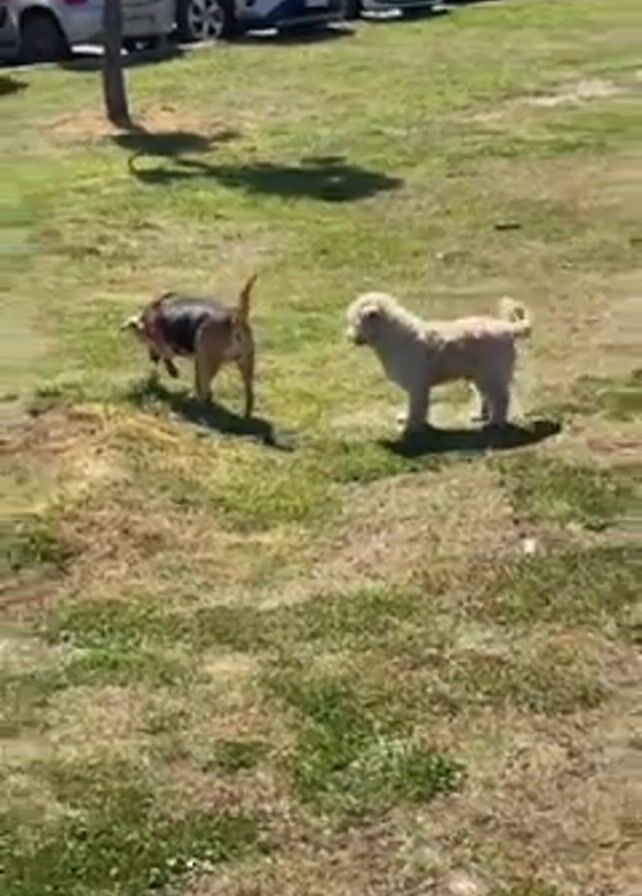 On a sunny day, two dogs, one tan-and-black with a pink harness and one white, are in a grassy area near parked cars