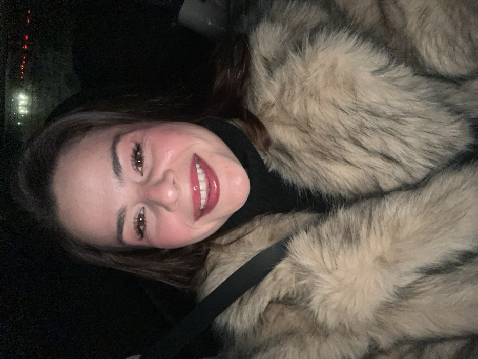 A woman smiles, facing slightly down towards the camera. She is wearing a fluffy, tan and brown fur coat over a black turtleneck. A black seatbelt diagonally crosses her body. The background is dark, with a blurred image of lights visible through a window. Her makeup is noticeable, with rosy cheeks and glossy red lips. The image is taken at a slight angle.