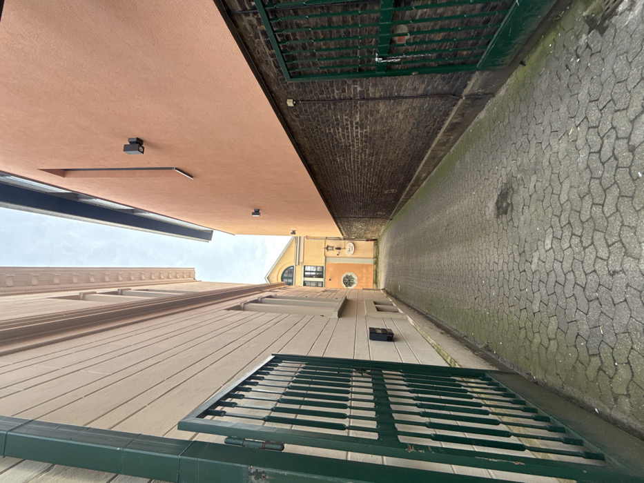 The image depicts a narrow, paved alleyway in Wuppertal, Germany, viewed from a low angle, leading towards a distant building under an overcast sky. On the left, a multi-story building features a light beige stucco facade with subtle horizontal banding and a decorative cornice. A dark green, vertically-barred metal gate, approximately 1.5 meters high, stands partially open, revealing part of the building's side. Below this gate, a small black rectangular utility box is mounted on the wall, above two small, horizontally rectangular window openings. On the right, another multi-story building displays a peach-colored stucco upper facade, supported by a lower wall of dark brown, possibly soot-stained, brickwork. Two modern black wall-mounted light fixtures are present on the stucco, along with a narrow, vertical dark-framed opening extending downwards. A dark green, vertically-barred metal gate, mirroring the design of the left gate, is fully closed and secured by a white metal chain. A black cable runs vertically along the brick wall near the gate. The alley floor is paved with interlocking grey hexagonal concrete pavers. The pavement exhibits minor moss or algae growth along the edges and in some crevices, along with several dark, irregular stains. At the far end of the alley, a third building, painted in a yellow-ochre hue, is visible. It features a prominent arched window on an upper floor, and a circular decorative element or window is situated lower on its facade. An antique-style black metal wall lamp is affixed to this building, next to a small, white rectangular sign. No individuals, vehicles, or active subjects are present in the scene.