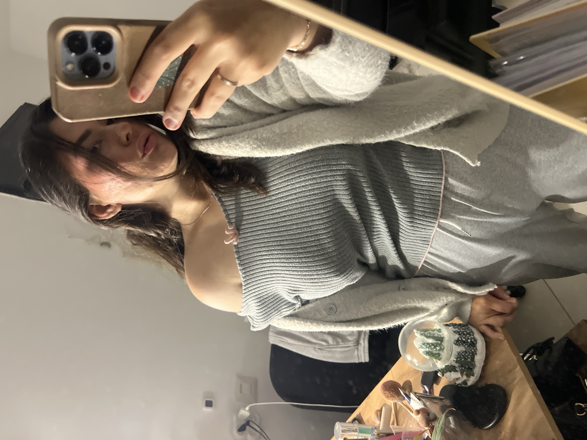 An individual is depicted in a mirror selfie, standing indoors in what is identified as a residential setting in Kiryat Bialik, Israel. The subject is a female, visible from approximately mid-thigh to head, with long dark hair and visible skin texture on the left side of her face. She is wearing a grey ribbed off-the-shoulder top, a light grey button-up fuzzy cardigan, and light grey sweatpants with a pink trim at the waist. Her right hand, adorned with a silver-colored ring on the ring finger and a gold-colored bracelet on the wrist, holds an iPhone in a light brown case, positioned to capture the reflection. Her fingernails are painted a light red/pink color. Her left hand rests on a wooden surface to her side. The environment reflects a cluttered personal space. On the wooden surface to the subject's left, various cosmetic items, brushes, a black hairbrush, and a snow globe depicting a winter scene with snow-covered trees and houses are arranged. Behind the subject, a dark-colored chair with a grey garment draped over it is visible. The wall in the background is light-colored, featuring a white electrical outlet with connected cables and a dark square object. To the subject's right, a wooden frame partially obscures a vertical file organizer containing documents or cards.