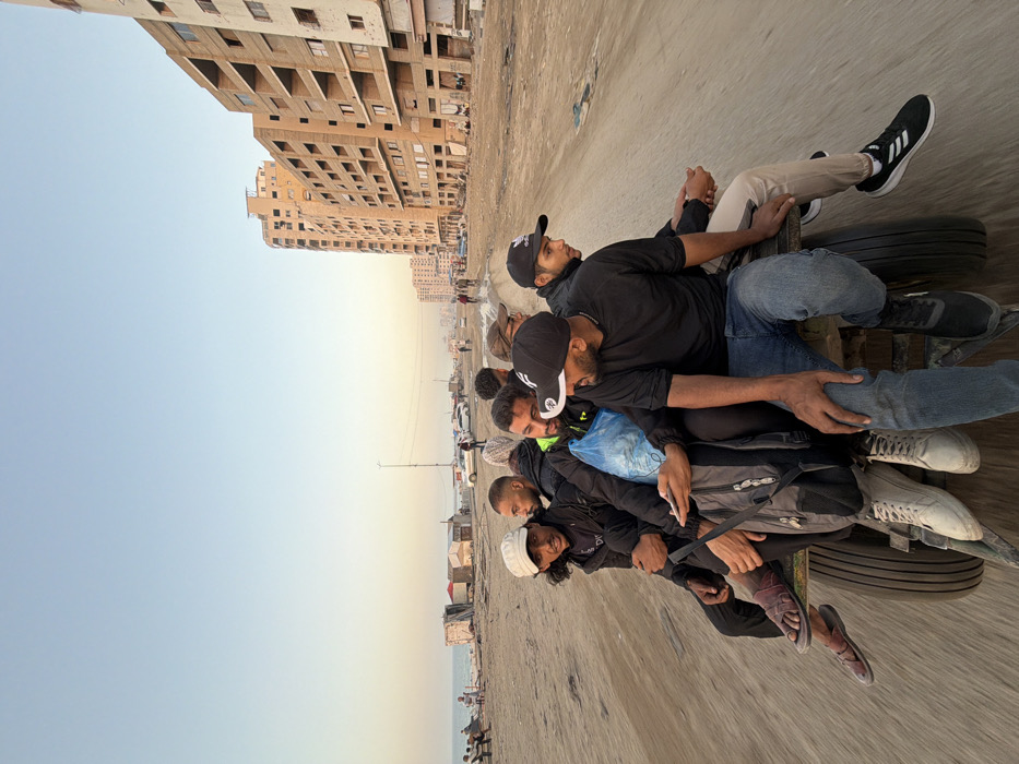 A group of men are piled atop a cart made of tires. They wear casual clothing, including caps and sneakers. Buildings line one side of the image, and the sky and a distant shoreline are visible on the other. The perspective is skewed, making the scene appear tilted. The cart and its occupants are in motion on a paved surface.