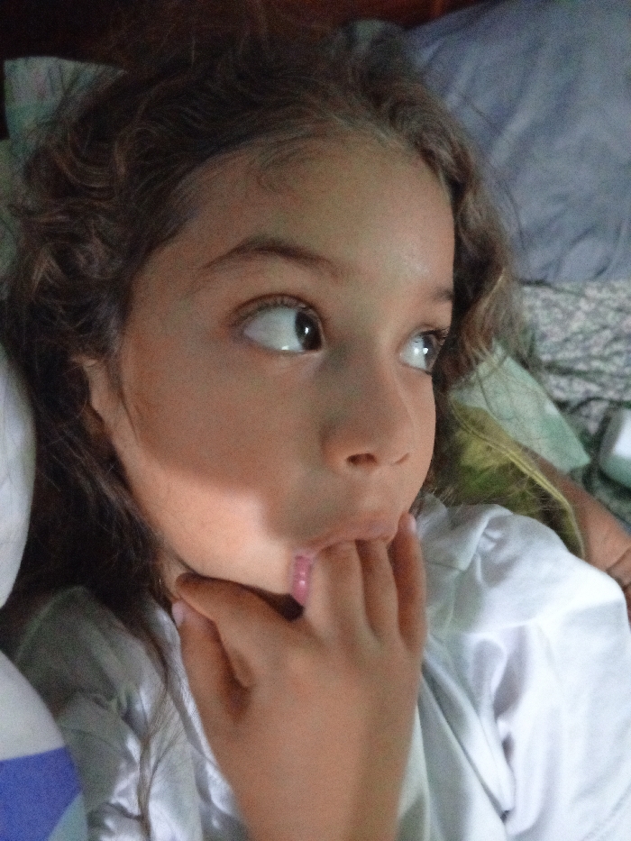 A young girl with curly brown hair looks to the right with wide eyes. She has fair skin and is wearing a white shirt. Her fingers are pressed against her chin, and one finger is in her mouth. The background consists of rumpled bedding with gray and green hues. The lighting highlights the left side of her face, casting a shadow on the right.