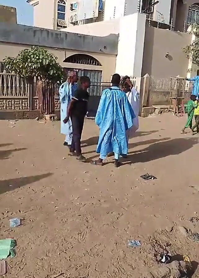 group of men gathered on a dirt street. Three of the men are wearing blue traditional clothing, while one man is wearing a black t-shirt and black pants. One of the men in traditional clothing is having his hat adjusted by another man in white traditional clothing. There are children walking in the background. The street is littered with trash. There are buildings in the background as well.