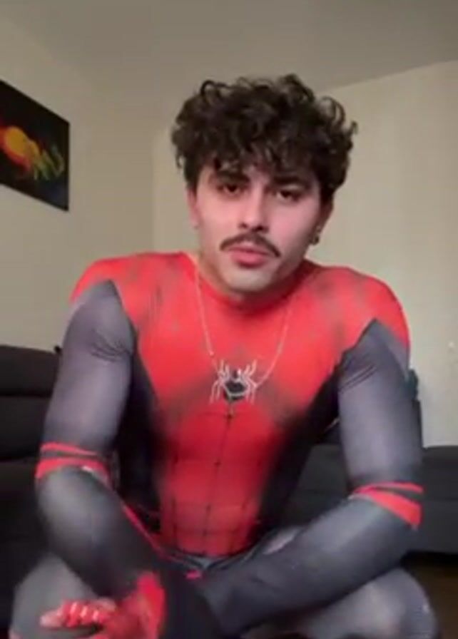 A man dressed in a red and gray Spider-Man suit crouches in front of the camera. He has dark curly hair and a mustache. He wears a necklace with a spider pendant. Behind him is a gray couch and a painting on the wall. He looks into the camera as he speaks.