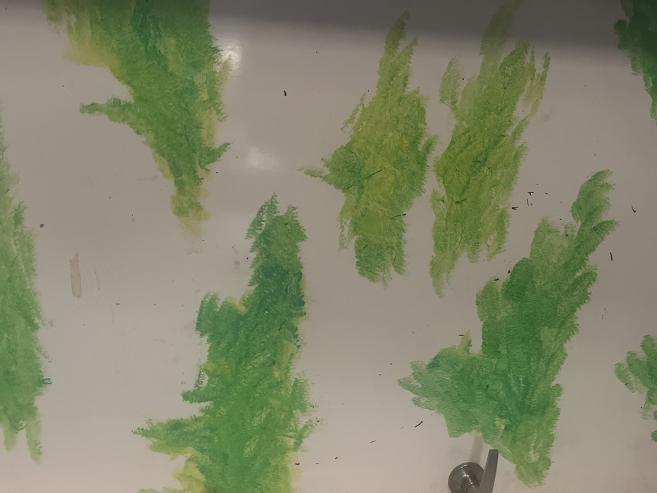 close-up of a white surface covered in green crayon markings. The markings are abstract, resembling loose, vertical strokes with varying shades of green and yellow. Some marks appear faded or worn, and there are occasional small dark flecks scattered across the surface. A metal handle is visible in the lower right corner. The overall impression is one of child-like art or vandalism.