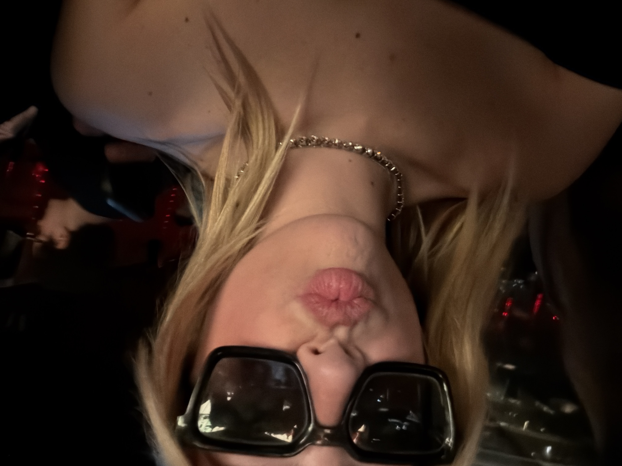 This image presents a close-up, chest-up view of a light-skinned individual with long blonde hair, situated within an unidentified indoor venue in Paris, France. The individual is prominently featured, wearing large, dark, square-framed sunglasses and a sparkling, possibly metallic, chain-link necklace. Their lips are puckered into a distinct "kissing" pose. The shoulders and upper chest are visible, suggesting an off-the-shoulder dark garment. The background is heavily blurred and dimly lit, revealing discernible red light sources. A secondary, indistinct figure with dark hair and a dark top is partially visible in the right background, oriented away from the camera. The environment indicates a social establishment such as a bar or club, characterized by low ambient lighting.