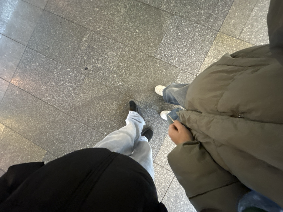 The image, taken from a high-angle perspective, shows the lower bodies of two individuals standing on a speckled gray tiled floor