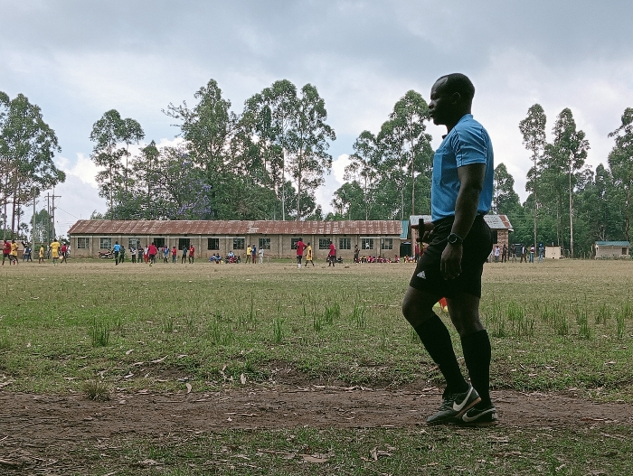 A soccer referee in black shorts, light blue shirt, and black socks stands on a dirt path next to a grassy soccer field. In the background, players are playing on the field in front of a long, low building with a rusted roof. A line of tall trees is behind the building, and the sky is overcast. The referee is wearing a watch and appears to be monitoring the game.