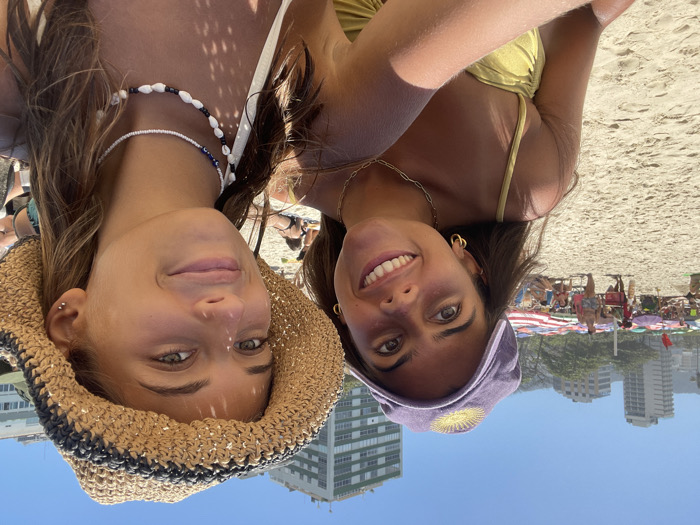The image depicts a crowded beach scene on a clear, sunny day in Rio de Janeiro, Brazil, specifically identifiable as Copacabana Beach due to the characteristic high-rise residential buildings lining the distant coastline. In the immediate foreground, two young adult females are positioned in a close-up, appearing to be taking a self-portrait. The female on the left wears a purple baseball cap adorned with a yellow circular emblem, gold hoop earrings, a thin gold chain necklace, and a light yellow/chartreuse strapless garment; she smiles broadly towards the camera. The female on the right wears a wide-brimmed straw hat with a dark woven band, two beaded necklaces (one white, one blue and white with small shells), and a white top; she also faces the camera with a subtle smile. The midground and background reveal a densely populated sandy beach, filled with numerous beachgoers seated on towels or chairs under an array of colorful beach umbrellas, many exhibiting red and white stripes. Several individuals are visible walking through the crowd, and at least one vendor pushing a cart is present. The horizon is dominated by tall, multi-story buildings under a bright blue sky.