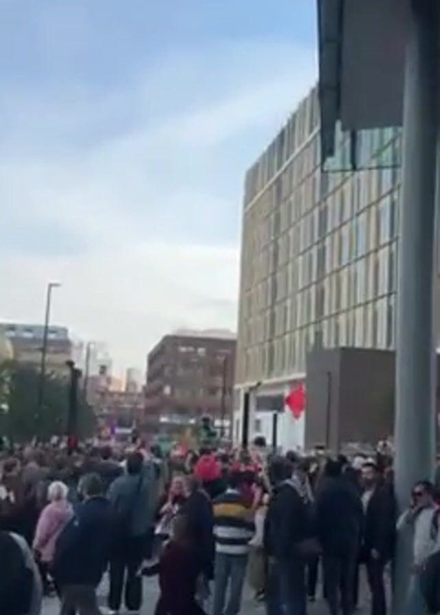 large crowd of people marching in a city. They are walking on a brick-paved street next to a tall, modern building with a glass facade. There are other buildings visible in the background. Some people are carrying signs or banners, but the text is illegible. The crowd is moving slowly and chanting. The sky is overcast, and the lighting is dim.