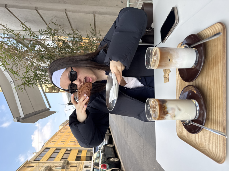 An outdoor cafe scene in Milan, Italy, is depicted on a bright, sunny day. A young woman with long dark hair, wearing a white headband, black rectangular sunglasses, and a dark puffer jacket over a white top, is seated at a white outdoor table. She is actively engaged in eating a pain au chocolat or chocolate croissant, holding it with her right hand toward her wide-open mouth. Her left hand holds a small, round metal plate with a white paper napkin on it. On the white table in the foreground, two tall glasses of layered iced coffee, each with ice and a distinct separation of dark coffee and white milk, are presented. Each glass sits on a small, dark brown circular saucer with a silver spoon. These items are arranged on a light-colored, rectangular wooden serving tray. A dark-cased smartphone and two small brown paper packets (likely sugar or sweetener) are also visible on the table surface. In the background, a street runs parallel to the cafe seating area, with several parked cars, including a green Mini Cooper on the left. Across the street, a row of multi-story buildings with yellow and orange facades and numerous windows is visible under a clear blue sky with sparse white clouds. To the right of the woman, a light-colored building facade with vertical architectural elements and green bamboo-like plants is present, partially shaded by a grey retractable awning overhead.
