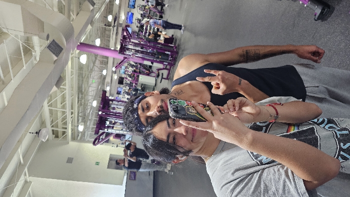 A photo of two individuals in a gym. The person in the back is wearing a black tank top and a blue bandana. The person in the front is wearing a grey t-shirt. The gym has purple exercise machines in the background and is brightly lit. The two individuals are posing for the camera and one person is holding up two fingers. They are holding a phone to take the picture.