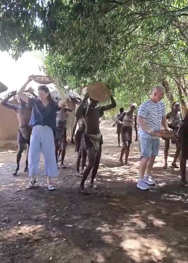 Under the shade of trees, a group of people is dancing in a dirt clearing. The group consists of both Black and white individuals. The Black dancers are wearing loincloths, some with leopard print, and balancing circular baskets on their heads. Two white individuals, a man in a striped shirt and shorts and a woman in a dark shirt and light pants, are attempting to emulate the dance, also balancing baskets on their heads. There are traditional huts visible in the background. The scene appears to be a tourist activity or cultural performance.