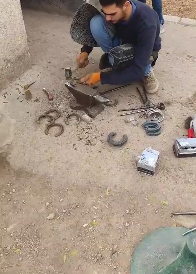 farrier preparing horseshoes and then shoeing a horse. He is crouched down and using a small hammer on an anvil to shape the shoe. Several finished horseshoes are lying on the ground around him, along with tools such as files and grinders. Then the camera pans to the horse’s feet, where a second person is working to attach the shoes, using a specialized tool. The scene is a dusty outdoor area next to a low concrete structure.
