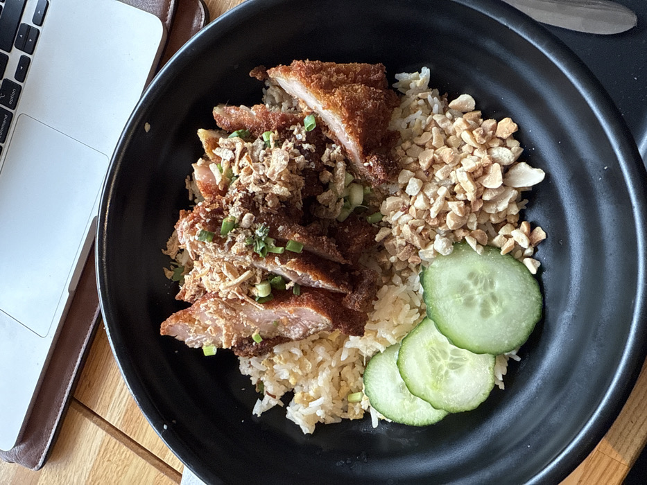 A black, matte-finished ceramic bowl containing a meal is centered in an overhead view. The bowl holds a base of white, slightly glossy rice. On top of the rice are several slices of reddish-brown, deep-fried, breaded meat, garnished with chopped green onions and golden-brown crispy fried shallots. To the left of the meat, three circular slices of green cucumber rest on the rice. To the right, a pile of light brown, crushed peanuts covers a section of the rice. The bowl sits on a dark surface, with a light brown wooden table visible in the upper background. A silver laptop computer with a black keyboard rests on a dark brown leather-like mat in the upper right background. The location is Unknown, Unknown.