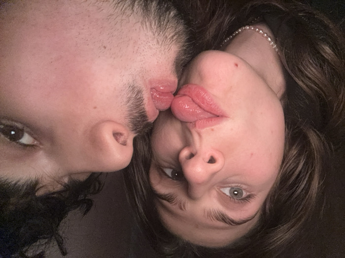 A close-up image depicts two young adults interacting in an indoor setting in Sofia, Bulgaria. On the left, a female individual with long dark hair, light-colored eyes, and wearing a pearl necklace extends her tongue outwards. She looks directly towards the camera. On the right, a male individual with dark curly hair, dark eyes, and facial stubble puckers his lips, making contact with the female's extended tongue. His visible right eye is directed towards the camera. The background is dark and featureless.