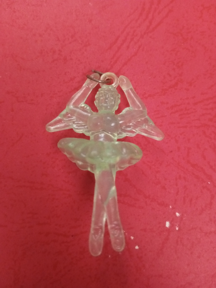 A translucent, possibly plastic, ornament of a ballerina rests on a textured red surface. The ballerina has a small pair of wings, arms raised above its head, and wears a tutu. A small metal loop is attached to the head of the ballerina and holds a plastic ring. The ballerina has a slightly green-ish tint.