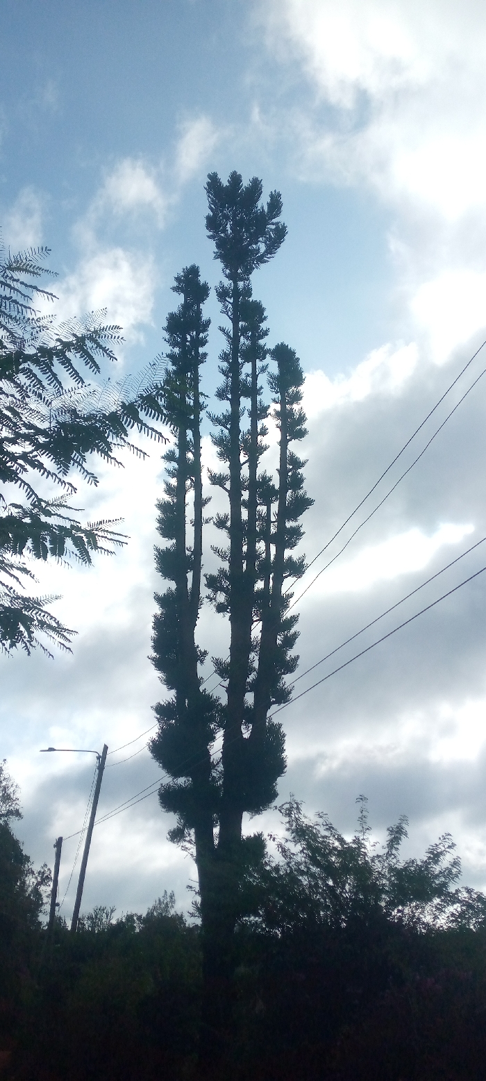 A tall, slender cell tower disguised as a cluster of pine trees stands against a cloudy sky