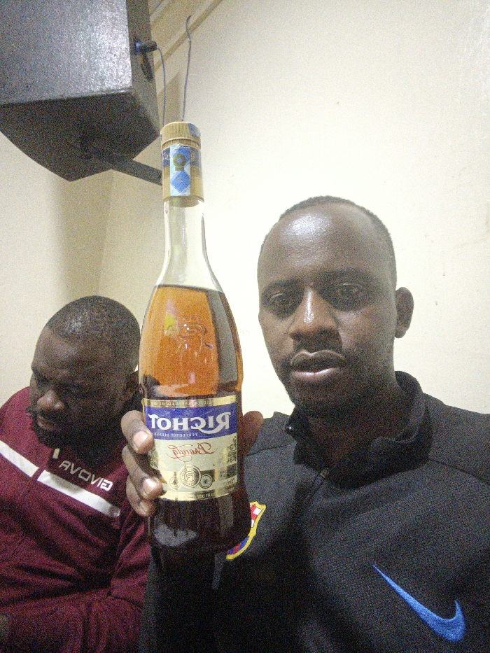 Two men are posing for a photo with a bottle of Richot brandy. One man, out of focus, is wearing a maroon sweatshirt. The other, holding the bottle, is wearing a black Nike top. The bottle is about half full with a golden liquor. In the background is an off-white wall and what appears to be a speaker system mounted on the wall. The cap of the bottle has an intricate pattern.
