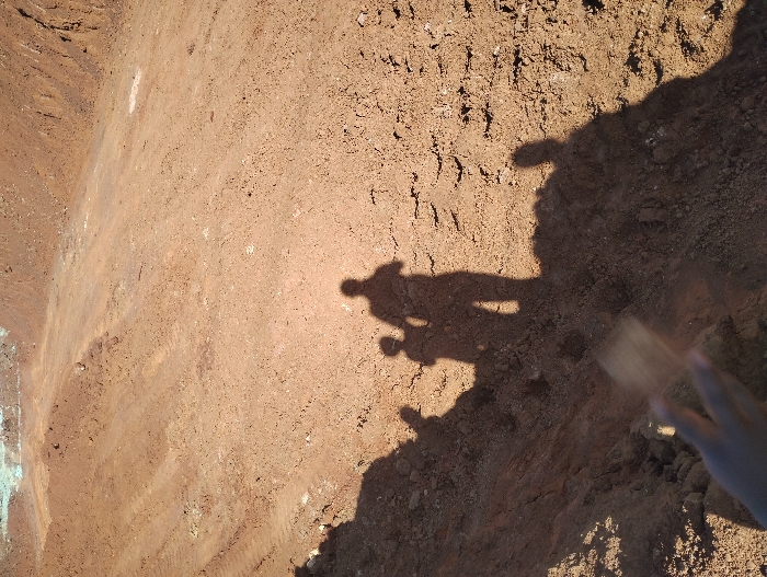 The image captures a sunlit outdoor scene in Gitaru ward, Kenya, at an extensive excavation or construction site. The ground consists primarily of reddish-brown disturbed earth, exhibiting varying slopes and textures. Visible in the lower left foreground is a blurred, dark-skinned hand holding a small, light-colored rectangular object between two fingers. Directly in front of the hand, distinct shadows are cast onto an earthen mound: one large shadow resembling an adult, and a smaller shadow resembling a child positioned closely beside the adult. Another partial, less defined shadow is visible to the right. The background features a flatter section of reddish-brown earth marked by tire tracks, leading towards further elevated earth banks. A distant bank in the upper background shows a lighter, possibly greenish, soil or sparse vegetation. The strong shadows indicate bright, direct sunlight.