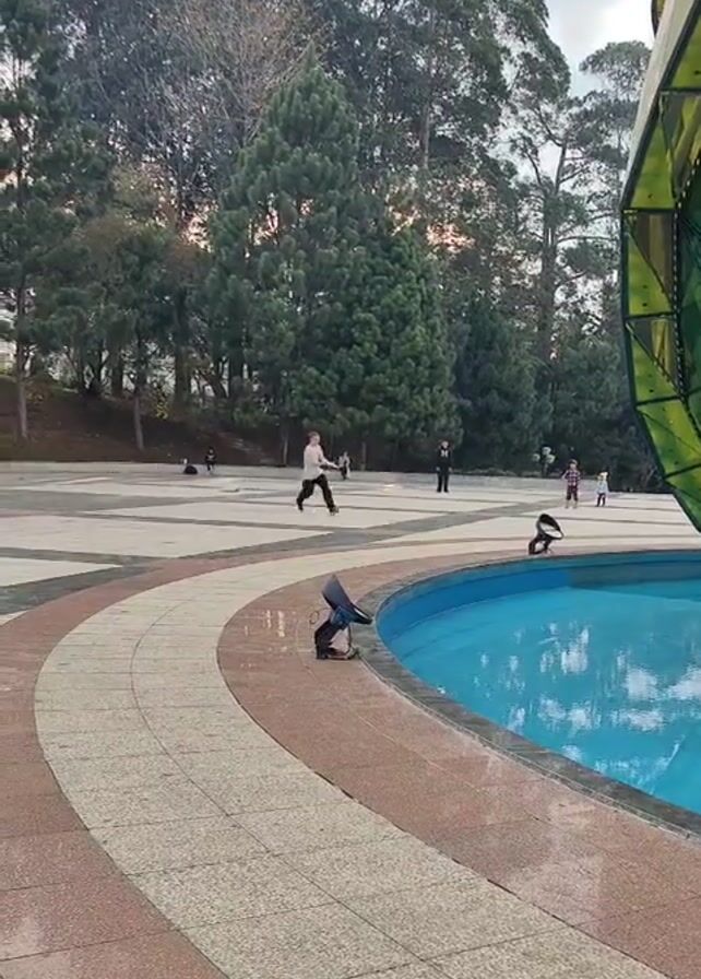 The camera captures a view of a public square with a fountain. A man wearing a white shirt and dark pants is seen throwing and catching a white frisbee in the open square. Other people, including adults and children, are also scattered around the square, with some sitting and others walking. The square is paved with a pattern of light and dark colored tiles. A round fountain with bright blue water is prominently visible in the foreground. In the background, there are several tall trees providing a green backdrop. Part of a large, geometrically shaped sculpture with a green and yellow design is on the right side of the frame, partially obstructing the view. The sky above is overcast.