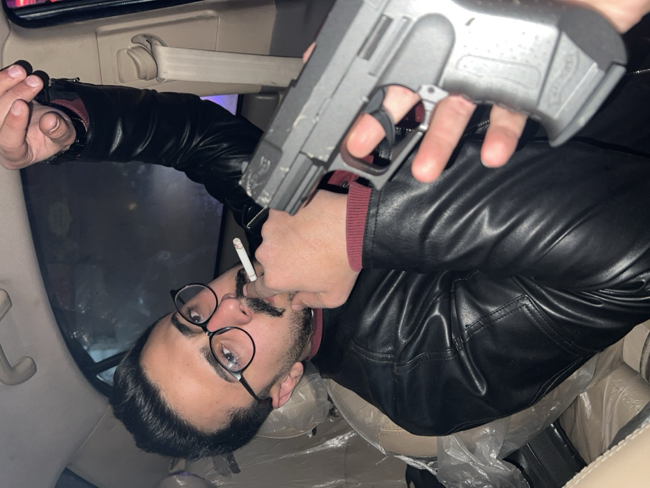 A man with glasses and a mustache holds a gun to his head while smoking a cigarette in a car. He wears a black leather jacket with a red sleeve. The car interior features beige seats covered in plastic. The image appears to be taken from an upside-down angle. The gun's color is gray. The car's interior lights and window are also visible.
