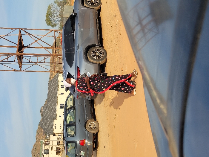 A woman with a white headscarf stands between two grey cars. She wears a black floral outfit with a red trim and white sandals. The background includes a brown dirt surface and a blurred object. A metal structure and a building near a hill are also visible under a blue sky.