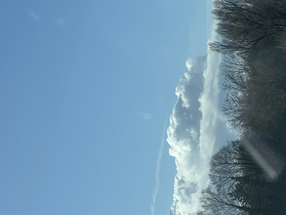 The image displays an outdoor scene dominated by a clear blue sky, a band of cumulus clouds, and a dense treeline. The upper two-thirds of the frame feature a bright, light blue sky with a few wispy, high-altitude cloud formations visible in the upper left and right. A soft, circular, diffuse bright spot is present in the mid-upper sky. A prominent horizontal band of white and grey cumulus or stratocumulus clouds occupies the middle ground, extending across the entire width of the image. The lower third of the image shows the upper sections of a dense forest or treeline composed primarily of bare deciduous trees, indicating a winter or early spring season. A darker evergreen tree is visible on the far left. A diagonal streak of light or glare is observable in the lower-left quadrant, suggesting the image was captured through a reflective surface. No individuals, specific man-made structures, or active interactions are depicted. The scene is located in Illkirch-Graffenstaden, France.