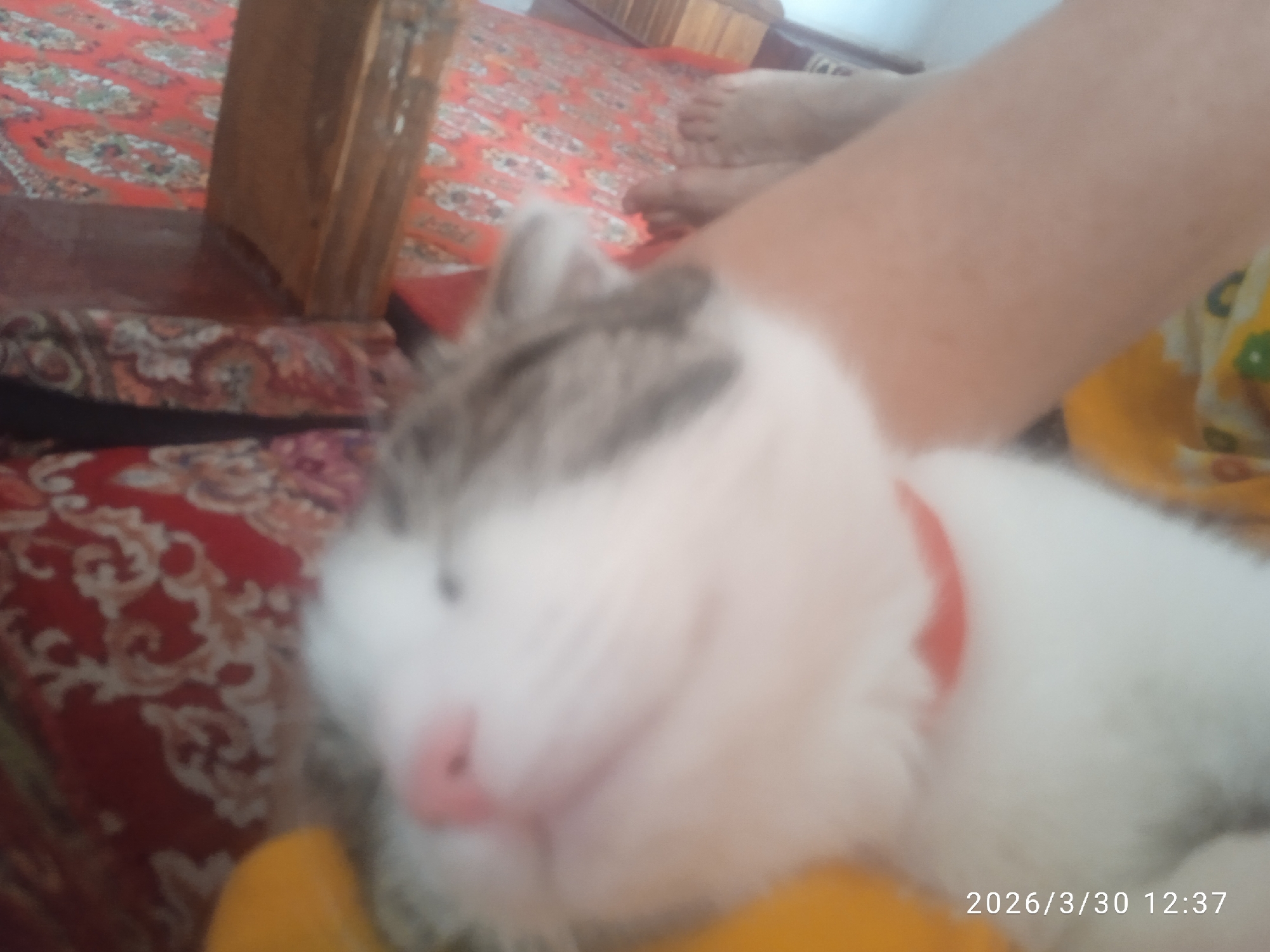 blurry, close-up shot of a white and gray cat with a pink nose, wearing a red collar, and seemingly lying down. The background includes a patterned red carpet and a partially visible human arm and foot. The timestamp indicates the photo was taken on March 30, 2026, at 12:37. There is no contextual information to suggest this image was taken in Khujayli, Uzbekistan.