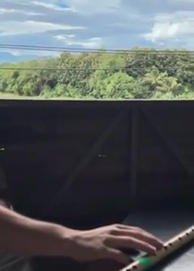 person seated on a porch overlooking a scenic landscape. The camera focuses on their hand placing a colorful flute on a table. The background reveals lush greenery and a cloudy sky. The scene gives a sense of tranquility and relaxation.