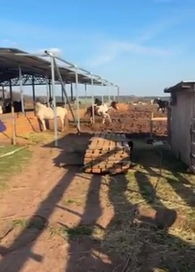 The scene unfolds on a sunny day at what appears to be a horse farm or ranch