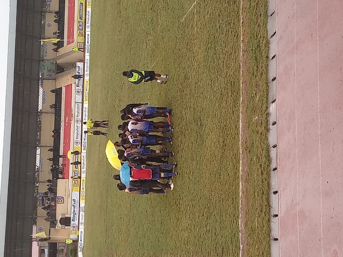A sports team in blue and white uniforms huddles on a green field, near a yellow umbrella and uniformed staff. In the background, stadium seating is visible with advertisements along the wall. A running track edges the field. The image appears to be taken during a team moment before or after a match.