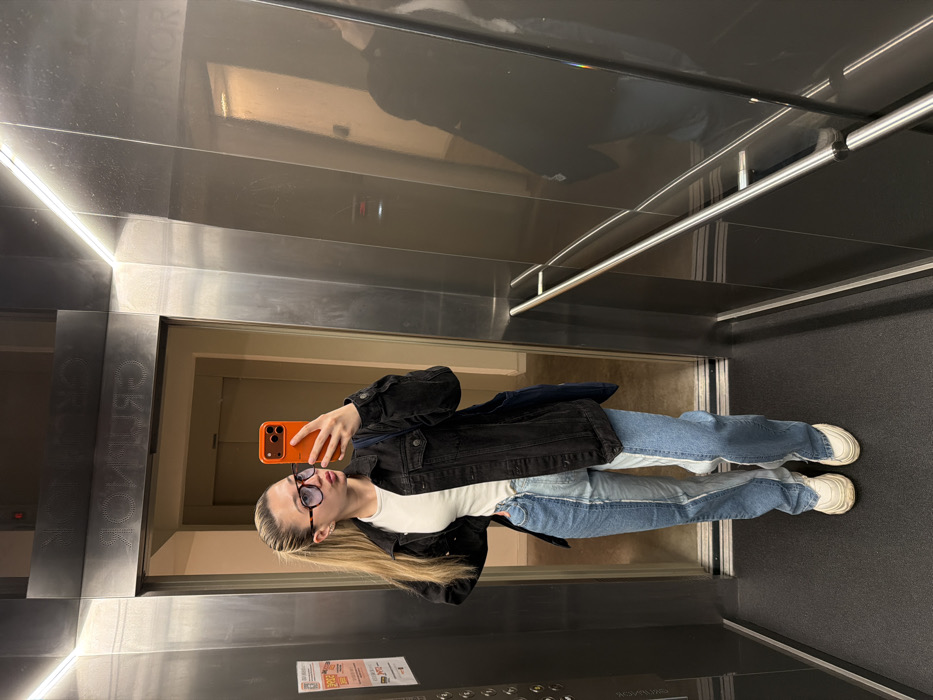 A female individual is captured in a mirror selfie inside an elevator cabin