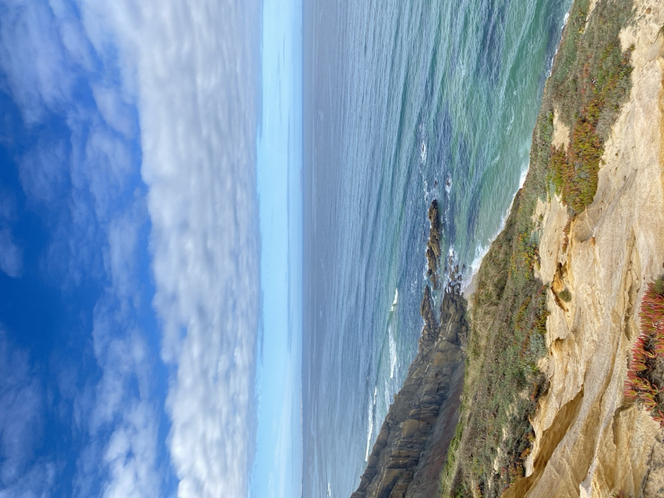 The image displays a panoramic coastal landscape located within the municipality of Caldas da Rainha, Portugal. The upper portion of the frame features a clear blue sky interspersed with scattered white and grey cumulus clouds, which are denser in a band across the middle of the sky. Below the horizon, the Atlantic Ocean extends into the middle of the image, exhibiting a gradient of colors from deep blue offshore to lighter turquoise and green closer to the land, with subtle wave patterns and white foam near the shore. The left side of the image is dominated by steep, rugged cliffs composed of layered, eroded rock in shades of ochre and dark grey-brown, descending towards the water. At the base of these cliffs, a narrow strip of light-colored sand is visible, interspersed with dark, jagged rock formations where small waves are actively breaking. The foreground and the slopes of the cliffs are covered with sparse, low-lying coastal vegetation, including patches of reddish-leaf succulents and mixed green and dry grasses. No human figures, animals, or man-made structures are visible in the scene.