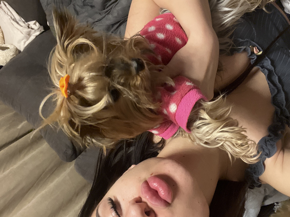The scene is an interior domestic setting in Plovdiv, Bulgaria, featuring a partial view of one human and one canine subject. The human subject, positioned on the left, has dark hair, closed eyes with prominent eyelashes, and full, puckered lips. They are wearing a dark-colored top with ruffled detailing. A slender strap, possibly from an undergarment or accessory, with a small, reflective charm is visible near the upper chest. The canine subject, a small dog with long, light brown and tan fur, is held by the human's arms in the center of the frame. The dog is wearing a pink fleece garment with white polka dots. An orange, flower-shaped accessory is secured in the fur on top of the dog's head. The dog's face is directed towards the right, with its eyes mostly obscured by its fur. The background consists of soft, neutral-toned fabric and a dark grey upholstered surface, consistent with bedding or sofa cushions.