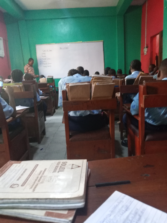 The image depicts a classroom setting, possibly in a school named "Soleil High School," as indicated by the notebook on the desk. Students wearing blue uniforms sit at wooden desks. A teacher stands in front of a whiteboard, where text is written. The walls are painted green and red.