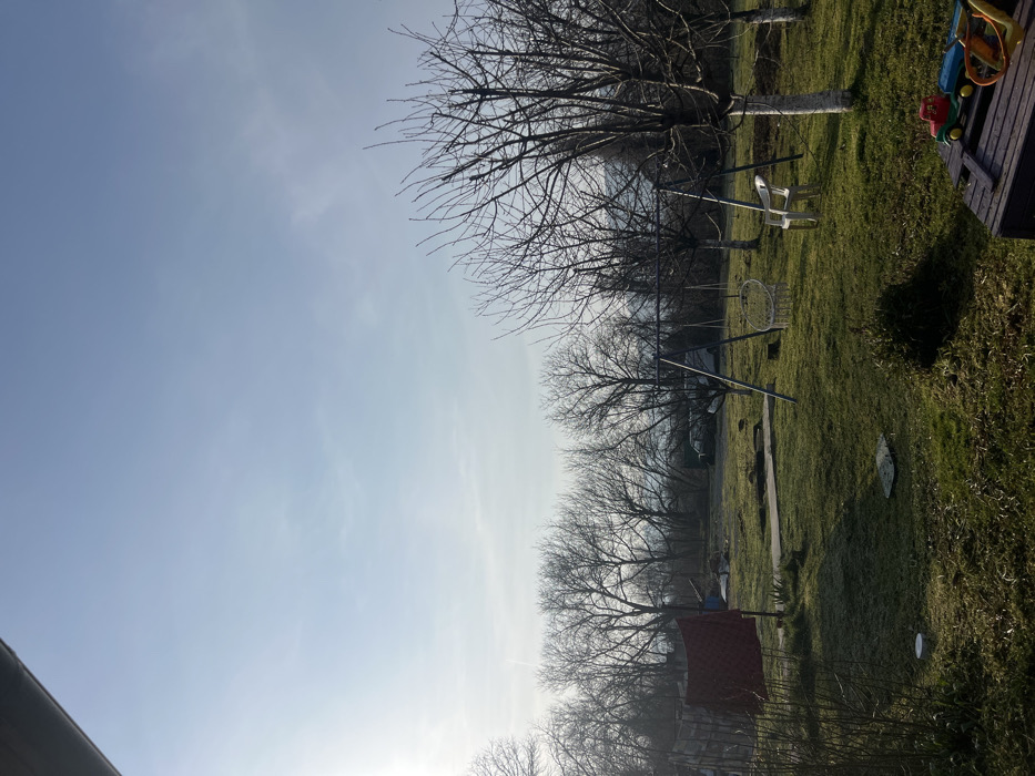 This image captures an outdoor residential scene in Parvomaitsi, Bulgaria, under bright daylight. The sky is clear blue with faint wispy clouds and a singular contrail visible in the upper-left quadrant. Intense sunlight emanates from the left, creating a visible glare. The foreground consists of a green grassy area interspersed with patches of bare soil. In the lower right, a dark wooden surface holds children's toys, specifically a red and green truck with a blue trailer, and a yellow and orange steering wheel-shaped object. A white plastic chair is situated on the grass to the right of a metal A-frame swing set, which features one white macrame-style circular seat. To the mid-left, a red fabric item, possibly a blanket, is draped over a wooden post. A small evergreen shrub grows in the lower-mid ground, with several flat, dark rectangular objects and a small white container resting on the grass. The midground is characterized by a dense line of bare deciduous trees, indicative of a late winter or early spring season. Several tree trunks on the right side are painted white at their bases. Through the trees on the left, a white van and another light-colored vehicle are partially discernible in the distance. The background reveals a hazy, undulating landscape. No individuals are present in the scene, and no actions or interactions are depicted.