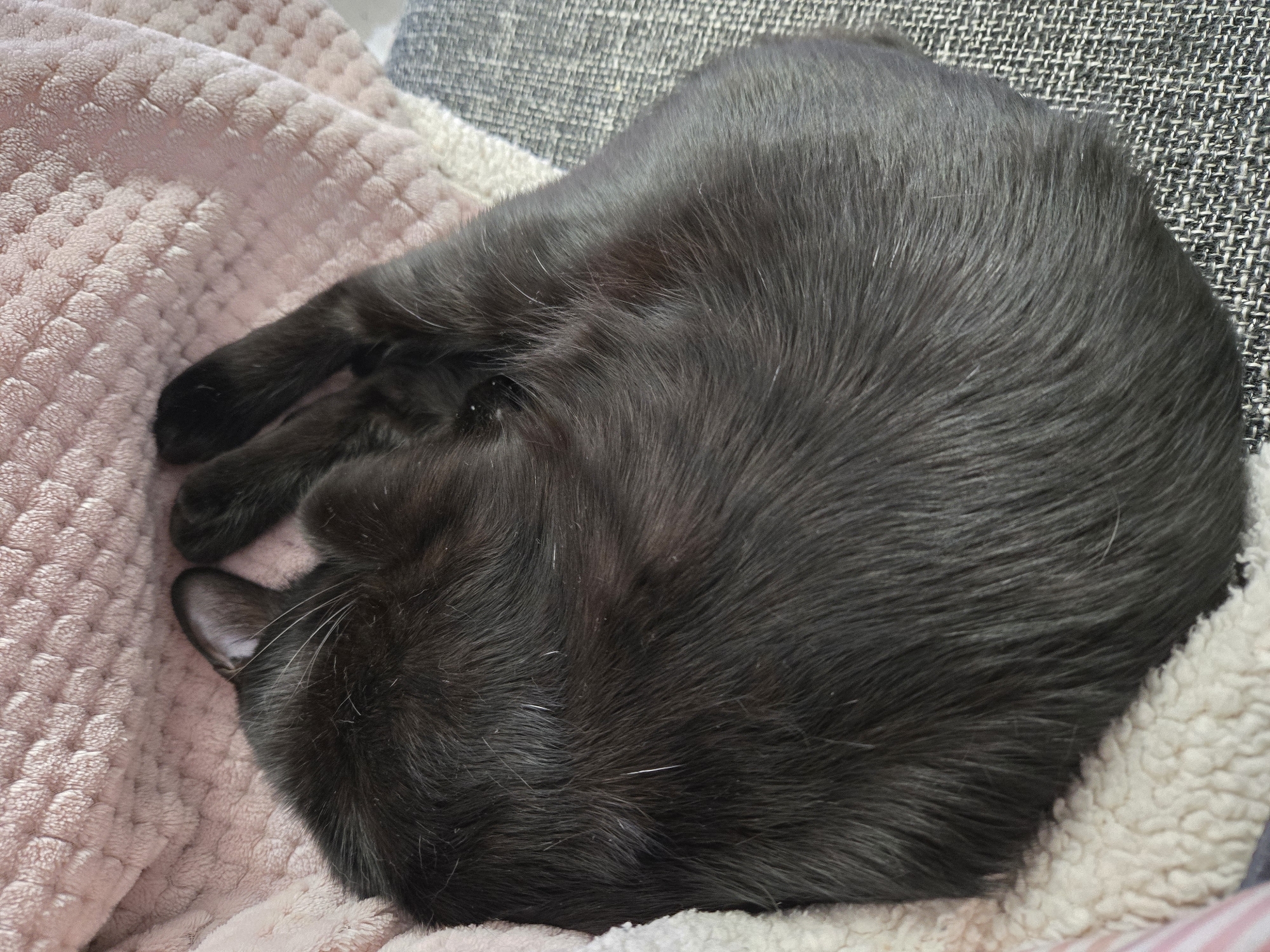 - "A black cat is depicted sleeping in a tightly curled position on soft bedding within a location specified as Sofia, Bulgaria" by FM-XO3Yw1, licensed under CC BY 4.0