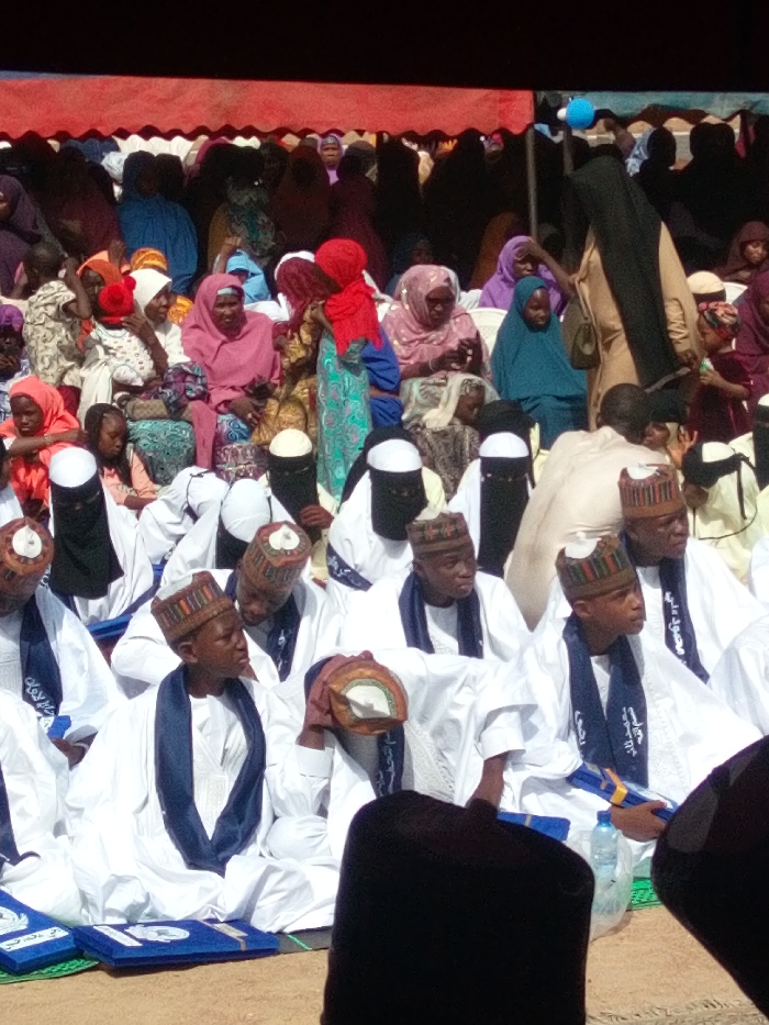 The image captures a large outdoor gathering in Tudun Murtala, Nigeria, under a red canopy that extends across the upper portion of the frame