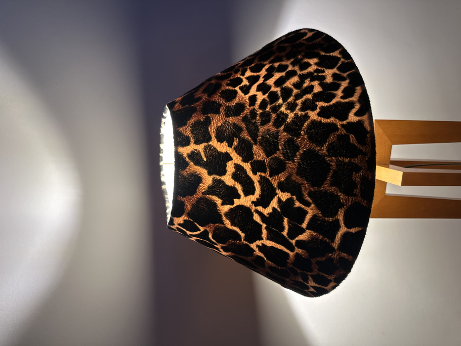 A lampshade with a giraffe print dominates the frame, casting a soft glow on the wall behind it
