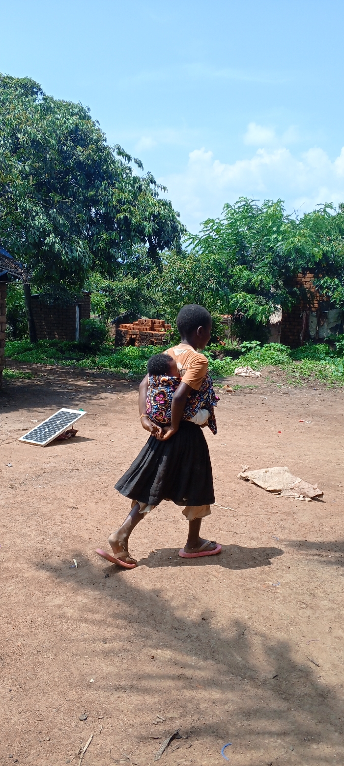 The image captures an outdoor scene in Abengwa, Democratic Republic of the Congo. A young individual, clad in a light brown shirt, dark skirt over light shorts, and pink flip-flops, walks from left to right across a reddish-brown dirt path. A baby, secured in a colorful patterned fabric carrier, is positioned on the individual's back. To the left of the path, a small, black and white solar panel rests on the ground, angled towards the sky. The background features dense green foliage from trees, a stack of red clay bricks, and visible portions of brick structures. The sky overhead is clear blue with scattered white clouds. The ground is uneven, hard-packed earth with minimal debris.