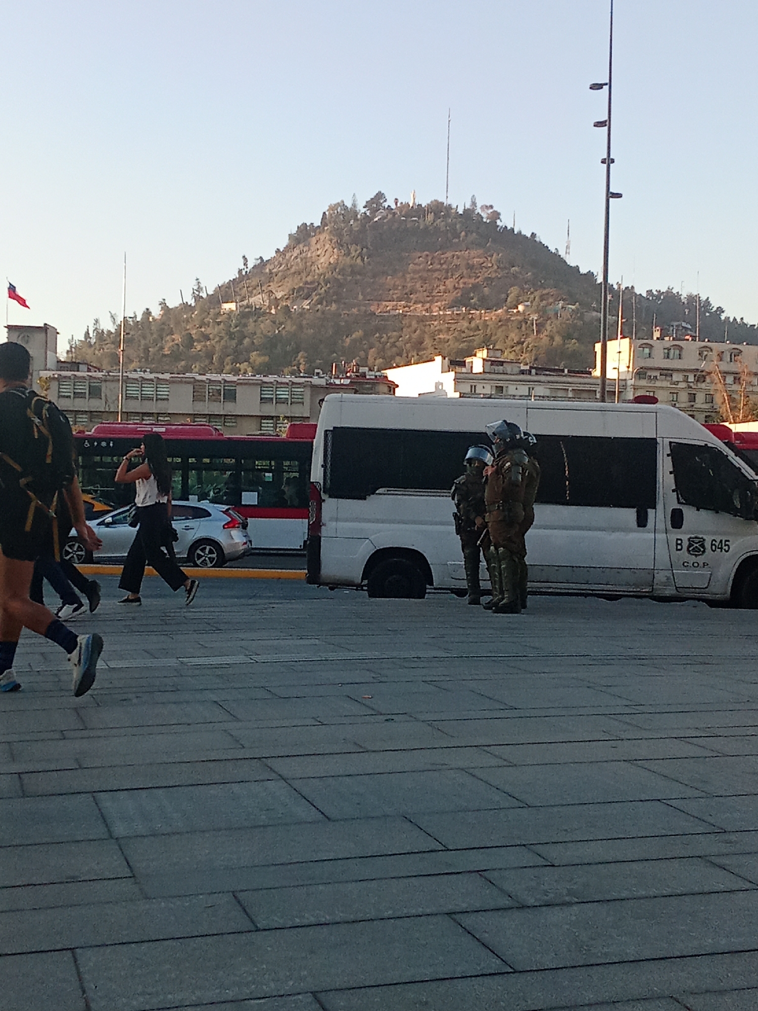 The scene is an urban outdoor environment in Providencia, Santiago, Chile, with the tree-covered Cerro San Cristóbal dominating the background under a clear, light blue sky. In the mid-ground, two individuals in full dark-colored tactical gear, including helmets and protective suits, stand stationary beside a white panel van, which appears to be a police or security vehicle. The van is marked with "B 645 C.O.P." on its side, has darkened rear windows, and is parked or stopped facing rightward. One of the uniformed individuals holds a baton. A third individual in similar gear is partially visible behind them. Further left, a woman with long dark hair, dressed in a white t-shirt and dark pants, walks rightward, holding a smartphone to her face. On the far left, partially visible, another person in dark athletic shorts, a t-shirt, blue socks, and sneakers also walks rightward. On the road behind the pedestrians and the white van, a red and white articulated public transit bus is moving rightward. A silver sedan is also visible on the road, positioned between the walking woman and the bus. The immediate foreground consists of dark grey rectangular paving stones. A small Chilean flag is visible on the roof of a building in the mid-left background. Tall streetlights are present on the right side of the image. The overall lighting suggests either morning or late afternoon.
