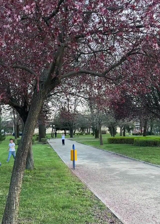 park path lined with trees in bloom with pink/red flowers. There are two children in the video. One child walks along the path away from the camera. Another child plays with a blue ball in the grass to the left of the path. A yellow trash can stands next to the path. The path is light grey, and some fallen flower petals are visible on it. The grass is green. Other trees, some without leaves, are visible further down the path.