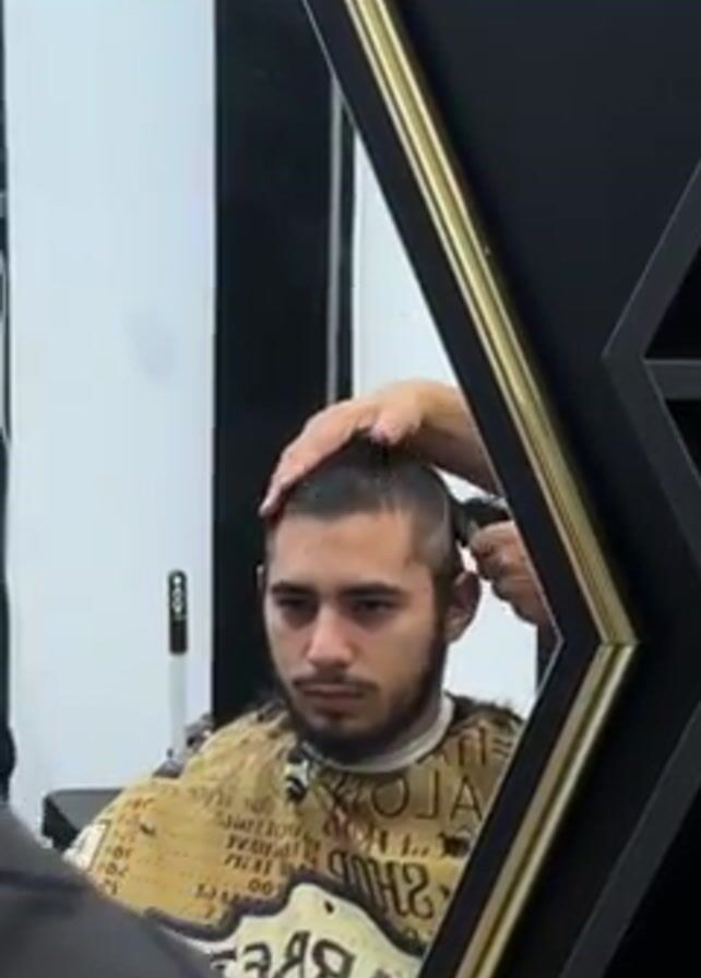 In a medium shot taken through a decorative mirror, a barber is giving a young man a haircut. The man is seated and wearing a patterned barber cape. His face is visible in the mirror, revealing a somber expression and a beard. The barber, visible from behind, is using clippers to cut the man's hair. The mirror is framed with black and gold geometric patterns. The environment appears to be a barbershop, with a white wall visible in the background. The lighting is bright, providing clear visibility of the scene.